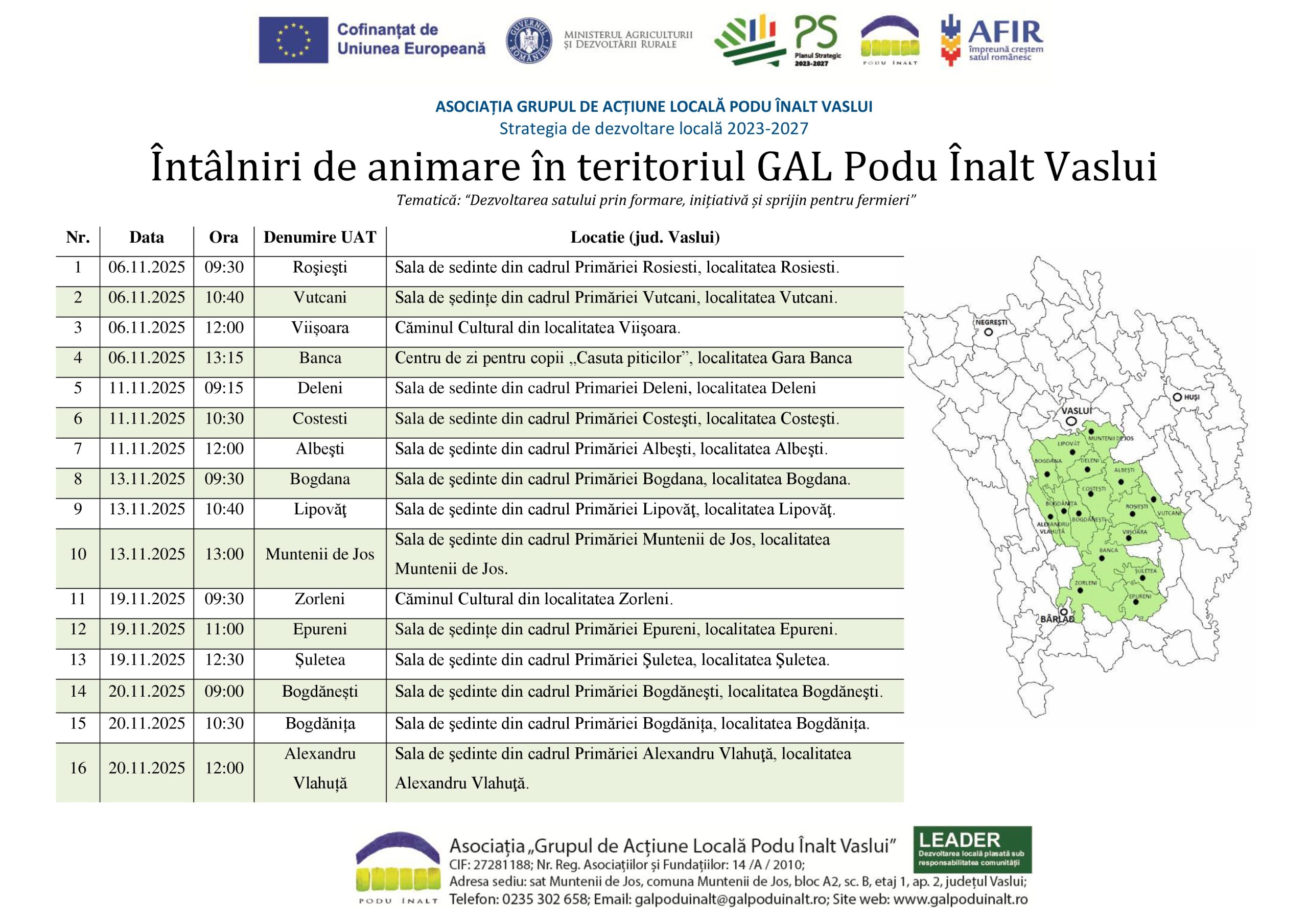 În luna noiembrie 2025, Asociația Grupul de Acțiune Locală Podu Înalt Vaslui organizează o serie de întâlniri de animare în comunele membre. Aceste întâlniri sunt dedicate informării ℹ️ și colaborării 🤝 pentru implementarea Strategiei de Dezvoltare Locală 2023-2027.